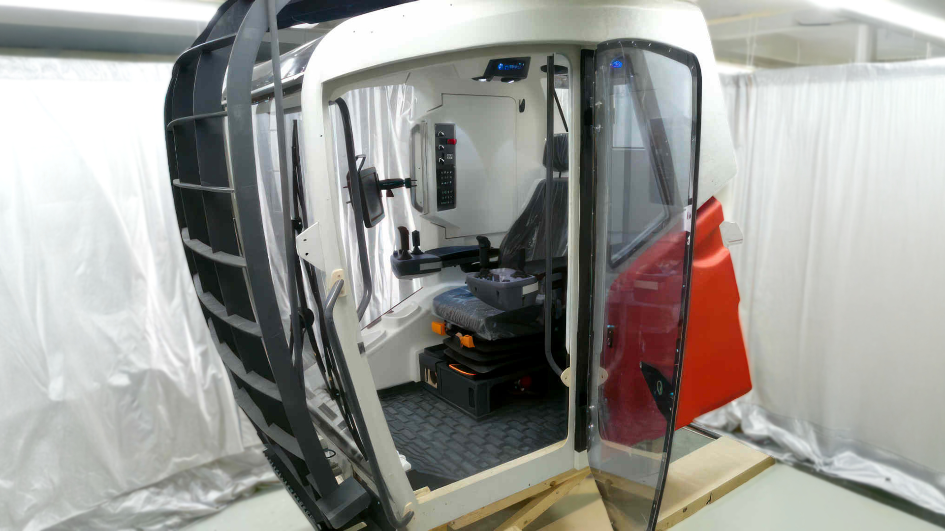 Konseptointivaiheessa ratkesi myös etulasin kallistus. Eteenpäin kallistetun etulasin ansiosta laitteeseen nousu on helpompaa, sillä hartioille jää enemmän tilaa ohjaamon kynnykselle noustessa. Samaten näkyvyys ylös puomistoon paranee, kun kattoikkunan kokoa voi kasvattaa.